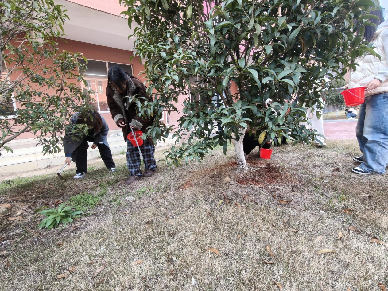 活动现场,师生志愿者们热情高涨、分工明确、协作默契,一派忙碌而有序的景象。大家手持铁锹、水壶、肥料等工具,迅速投入到养护工作中,各尽其责、默契配合:有的俯身弯腰,小心翼翼地为桂花树根松土,破除土壤板结,让根系得以自由呼吸、汲取养分;有的精准把控肥料用量,细致撒播、轻轻拌匀,为桂花树补充生长能量。每一道工序都细致入微、一丝不苟,志愿者们以饱满的热情、务实的行动,在春日暖阳中勾勒出一幅生动鲜活的护绿画卷,用双手为校园增添生机与暖意。