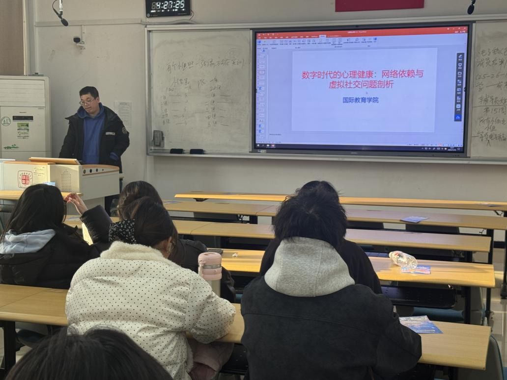 为深入开展心理健康教育,帮助同学们有效管理压力,提高身心健康,2025年11月25日下午,我院学工办副主任杨锡峰在红角洲校区W4501教室开展了“数字时代的心理健康”专题讲座。国际教育学院心理委员、大二和大三年级寝室心理联络员到场收听。