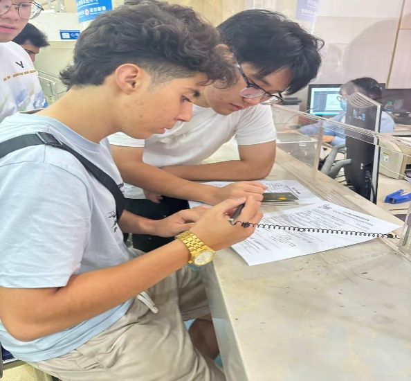 抵达学校后,志愿者们引导新生前往留学生公寓楼下进行报道。报到区按专业班级划分为四个区域,志愿者们分工明确:协助核对护照信息、录入系统的师生耐心细致;手把手教新生绑定校园卡、开通支付功能的同学步骤清晰;帮忙创建微信号、添加班级群和辅导员好友的志愿者更让新生快速融入集体。针对新生对宿舍环境的疑问,志愿者们还带他们实地查看宿舍,介绍空调、热水器的使用方法,甚至帮忙调试无线网络。原本繁琐的报到流程在志愿者的协助下变得高效有序,新生们纷纷点头致谢。