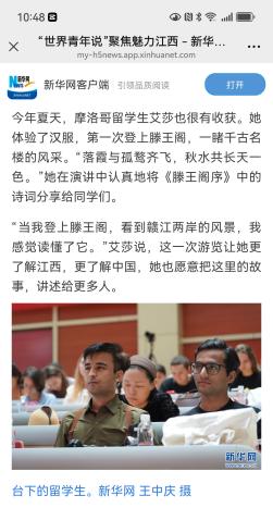 在中外学生演说环节,来自全省14所“留学江西”联盟高校的学生代表依次登台,围绕“魅力江西”分享独特见解与真挚感悟。我校留学生艾莎与中国学生刘曼珂联袂呈现了的汉语作品《千年一瞬 情系滕王阁》。艾莎用流利的汉语认真吟诵《滕王阁序》中的经典名句 “落霞与孤鹜齐飞,秋水共长天一色”,还动情分享了:“当我登上滕王阁,看到赣江两岸的风景,我感觉读懂了它。我因为这座楼、这首诗,而更了解江西,更了解中国了”。这段饱含真情的表述,已被 9 月 24 日新华网发布的《“世界青年说” 聚焦魅力江西》一文截取引用,成为展现江西魅力与我校中外人文交流成果的生动注脚。